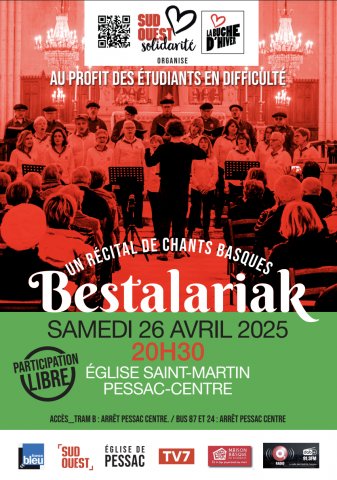 L’association Sud Ouest Solidarité avait souhaité notre collaboration pour soutenir son action d’aide au financement de six associations régionales qui luttent contre la précarité étudiante dans le domaine de l’alimentation, de la santé, du logement. Le choix de Pessac, domaine du campus universitaire, et de l’espace accueillant de l’église Saint Martin s’avéra favorable : ce fut une belle soirée, la collecte frôla les 1000 € et chacun repartit content, malgré les bémols des statistiques recueillies : sur les 105000 étudiants inscrits à Bordeaux, 4/10 vivent avec moins de 400€ par mois, 1/10 a déjà dormi dehors ou dans sa voiture, 4/10 sautent un repas, 6/10 disent ressentir des émotions négatives. Quelques chants basques nous aideront-ils à nous en souvenir ?