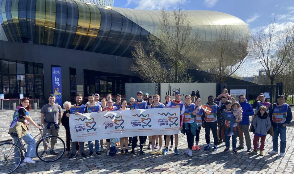 Par un temps doux et ensoleillé, nous nous sommes retrouvés à 10 h 30 à la Cité du Vin pour l’échauffement, reconnaissables avec nos dossards « euskara gara » (nous sommes la langue basque), slogan de la Korrika 24. Des coureurs, des marcheurs, des cyclistes, des adultes et des enfants, c’est au total plus d’une trentaine de personnes qui ont participé à cette première édition de la Korrika à Bordeaux. Dans une ambiance joyeuse, nous avons longé les quais de la Cité du Vin jusqu’à la Maison Basque, face à des promeneurs intrigués par nos tenues bariolées et nos chants en faveur de la langue basque.